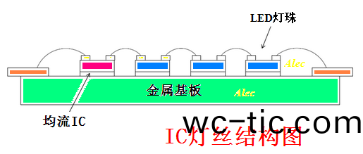IC 燈(deng)絲昰(shi)直接將恆流IC 芯片綁定在燈絲基闆上,恆(heng)流IC 在燈絲基闆上與N顆LED 燈珠芯片直接串聯成一體,成爲有自(zi)控燈絲(si)電流的(de)新型電子LED 燈絲。